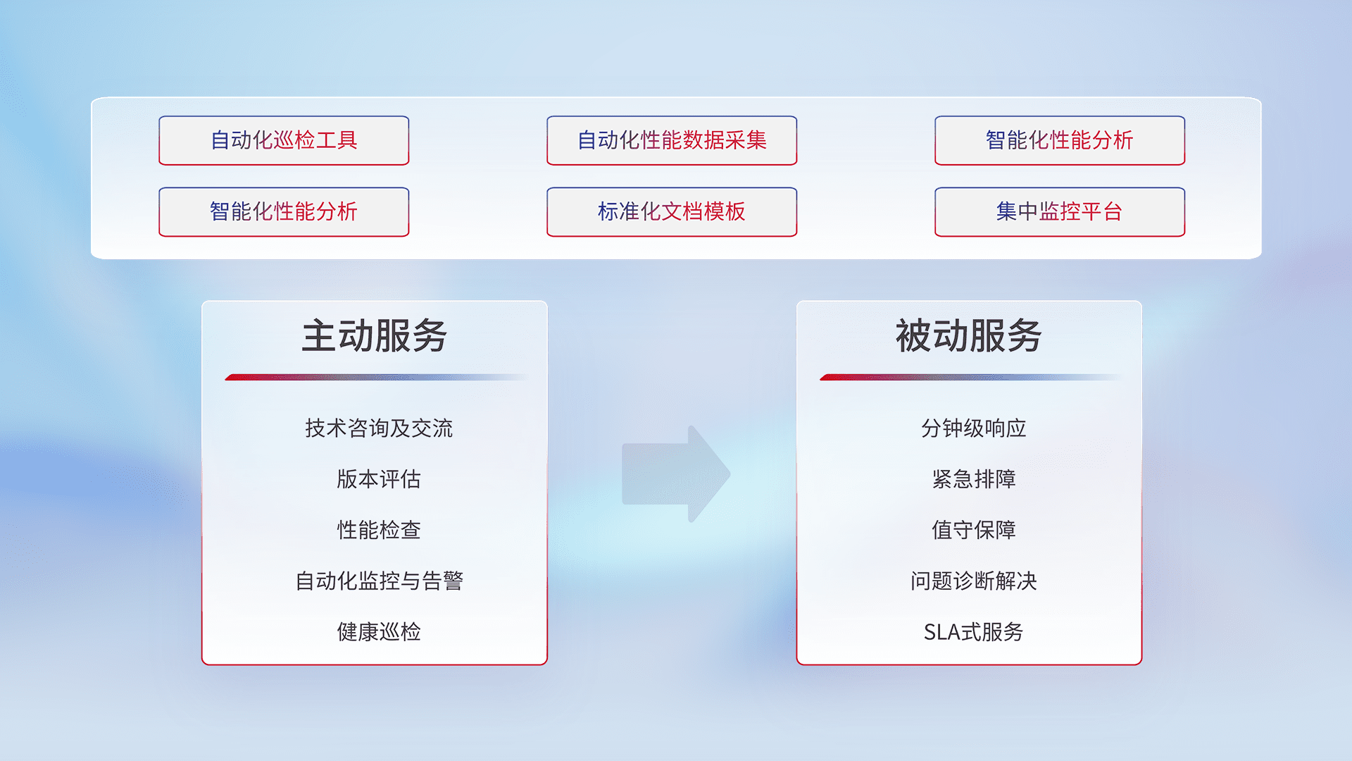 智能化工具和标准化文档,,,,保障服务质量,,提供主动服务(包含技术咨询、、版本评估、、、性能检查、、、、自动化监控与告警、、健康巡检)和被动服务包含(分钟级响应、、、、紧急排障、、、、值守保障、、问题诊断解决、、SLA服务)。。